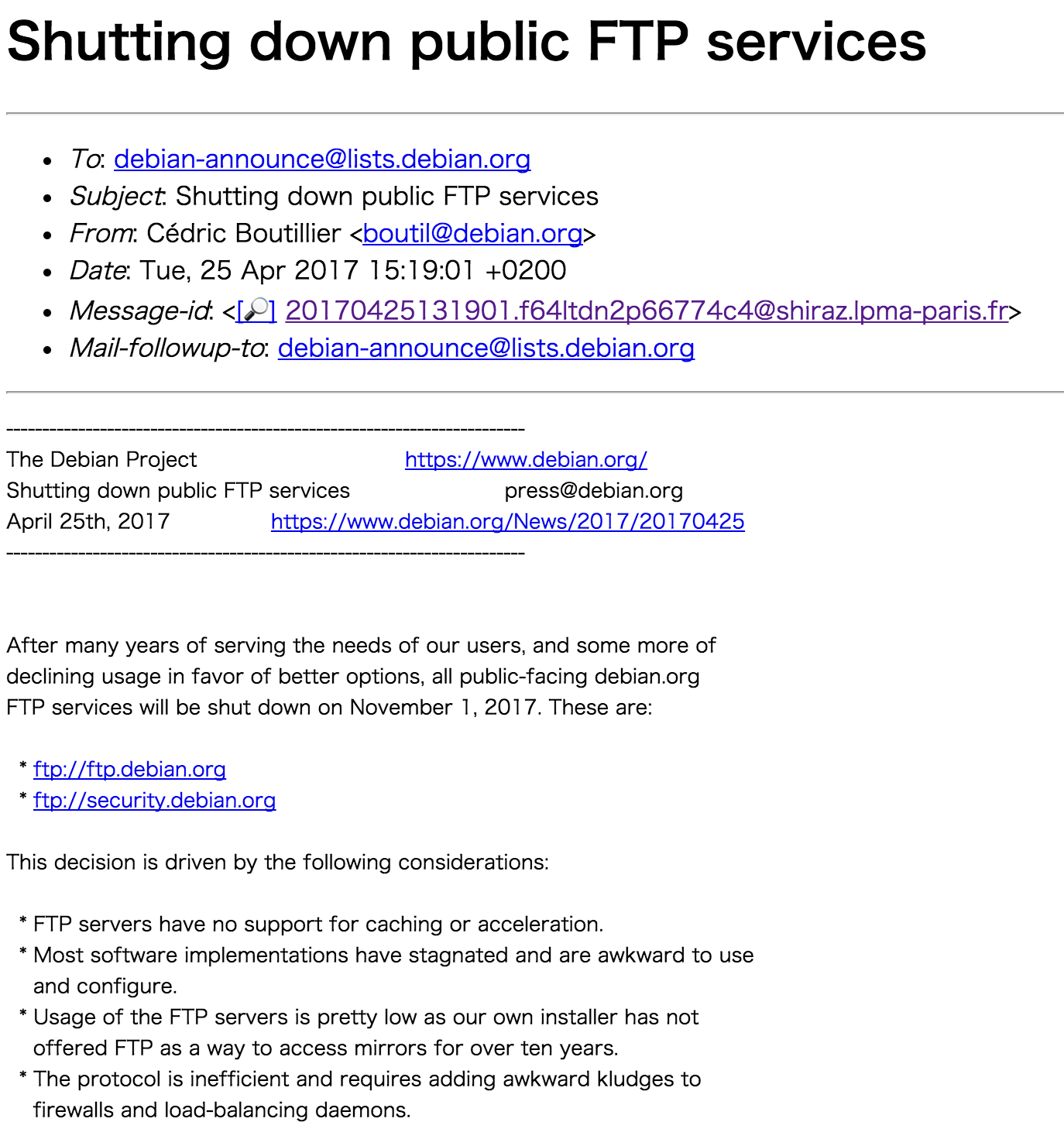 Debian 发布邮件公示,将于2017年11月1日关闭所有面向公众的 debian.org FTP 服务器,它们是: ftp://ftp.debian.org ftp://security.debian.org Debian 表示,这个决定是有以下考虑:FTP 服务器不支持缓存或加速;大多数软件实现也已停滞不前,使用和配置尴尬;而且 FTP 服务器的使用量非常低,协议效率低下。用户有更好的选择。 2017年4月26日业界资讯 Google Chrome Android 版更新,发布 58 正式版升级版“one step”?谷歌将带来全新 Android 拖拽功能 相关文章抢红包im 开源系统,红包im系统源码2025年12月31日抢红包im 的技术实现2025年12月31日房屋租赁管理系统,好租管家的客群都是谁?2025年12月31日wordpress the7 中文文章列表页摘要自动截取操作教程2025年12月30日马来西亚台球厅管理系统,台球室系统源码,台球厅 app2025年12月24日杭州APP开发公司哪家好?(2025)不踩坑的选型方法 + 真实对比清单2025年12月22日