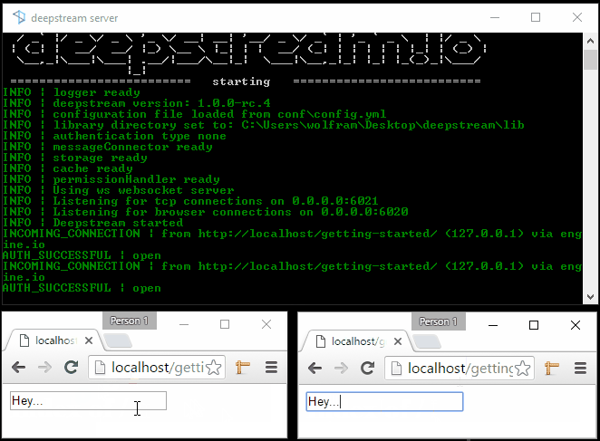 然后用户在两个单独的浏览器窗口中打开index.html页面(如上图所示),并在其中一个浏览器窗口的文本框中输入几个字符。文本框状态的转换 迅速由deepstream.io客户端通知安装好的deepstream.io服务器,将转变通过deepstream.io客户端通知第二个浏览器。 如入门教程页面上方的GIF动图所示,在字符的基础上状态的转换会非常迅速地送达。