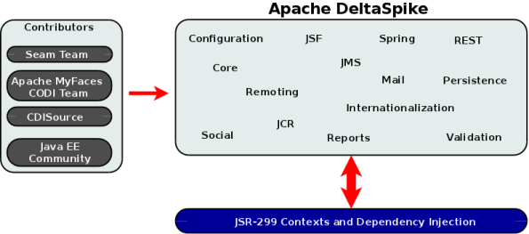 Apache DeltaSpike 包含一组 JSR-299 (CDI) 扩展,用于构建 Java SE 和 EE 平台的应用程序。