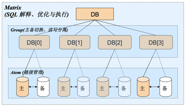 于是,我们做了第一次重大升级,在这次升级里,我们提出了一个重要的概念就是三层架构,Matrix对应数据库切分场景,对SQL有一定限制,Group对应读写分离和高可用场景,对SQL几乎没有限制。如图2所示。