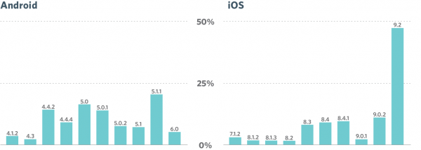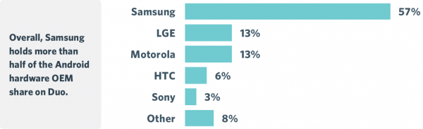 Duo实验室统计数据显示,总体而言,三星在Android设备市场份额是57%,LG电子和摩托罗在在Android设备市场份额均为13%。在iOS上,一半以上的iPhone都运行iOS 9操作系统,但在Android上,众多OEM制造商和运营商的合作伙伴关系,会影响特定硬件平台是否支持最新Android操作系统,以及需要多长时间才能进行更新。