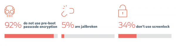 近日,Duo实验室的研究小组分析了当前Android设备安全状态,并且与iOS设备的安全状态进行了对比。根据他们发布的安全报告显示,平均10台Android设备当中只有一台已经启用了预启动密码加密;平均3台Android设备当中就有1台没有使用锁屏密码,而 20台苹果设备当中才有1台设备没有使用锁屏密码。