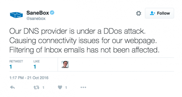 提供动态DNS服务的DynDNS报告遭到DDoS攻击,攻击主要影响它位于美国东区的服务。DynDNS称,它从周五11:10 UTC开始监视到对其Dyn Managed DNS基础设施的攻击,它随后采取措施缓和攻击。