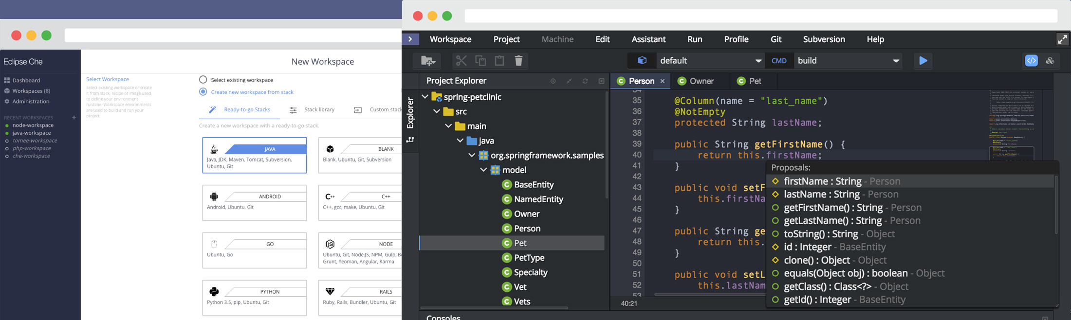 Eclipse Che 是一个高性能的基于浏览器的集成开发环境,通过提供结构化的工作区、项目输入、模块化扩展插件来支持 Codenvy 的引擎。Eclipse Che 采用 Java 开发,支持 Windows、Linux 和 OS X 系统。提供扩展功能用于支持多种编程语言。目前支持的语言包括:C++、Go、Java、Python、Ruby、SQL,提供语法高亮、代码分析、代码辅助和调试功能。