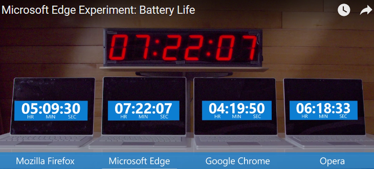 微软官方博客称,使用Edge而不是Chrome 将能增加3个小时的电池续航时间。微软在四台相同的Surface Book笔记本上运行四款流行的浏览器Firefox、Edge、Chrome和Opera,访问常用的网站如Facebook、YouTube、Wikipedia和 Amazon。结果显示,以耗电著称的Chrome只运行4小时19分就耗光了电,而Firefox是5小时9分钟,省电模式的Opera也只有6小时18分,而微软的Edge长达7小时22分钟,比Chrome延长了3个多小时。对经常移动办公的用户来说,Edge也许值得一试。