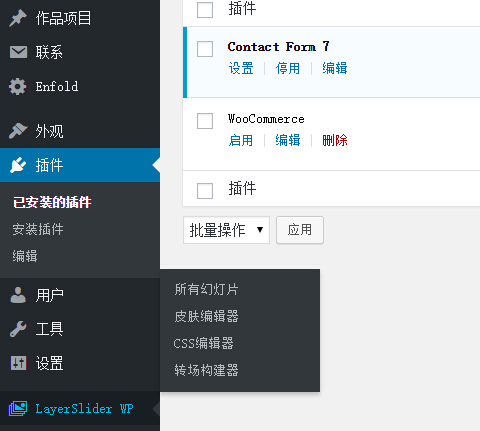 Contact Form 7、WooCommerce以及LayerSlider WP插件,这三款插件是可能会用到的。当然,如果不涉及电商模块,