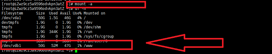 使用“mount -a”命令挂载新分区,然后用“df -h”命令查看,出现以下信息就说明挂载成功,可以开始使用新的分区了。