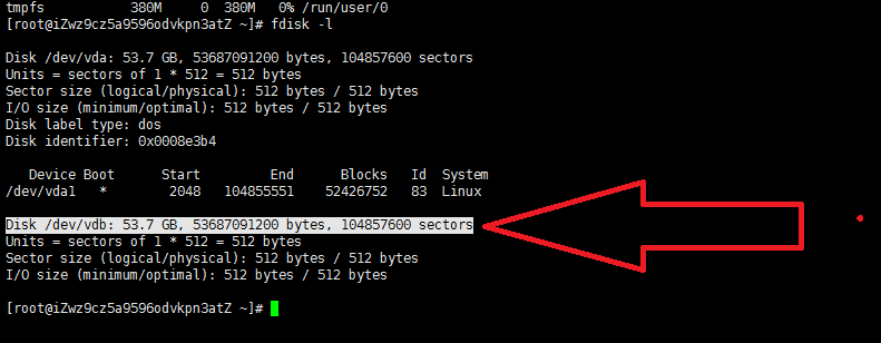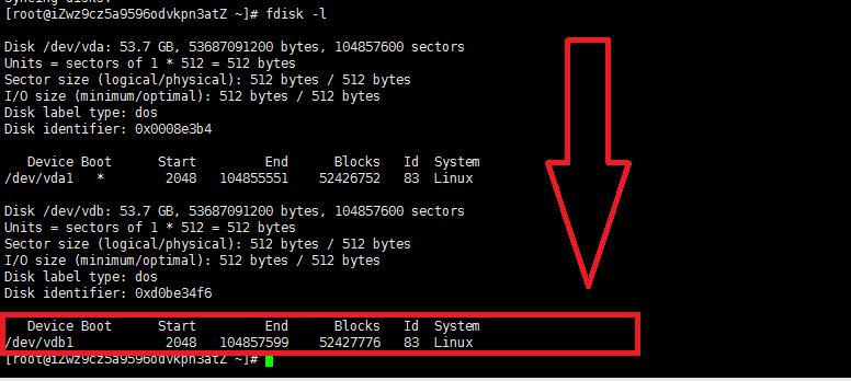第二步: 对数据盘进行分区。(始终记住,阿里云数据盘肯定是db标识的!)