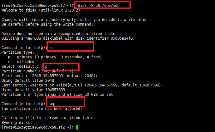对数据盘进行分区;根据提示,依次输入“n”,“p”“1”,两次回车,“wq”,分区就开始了,很快就会完成。