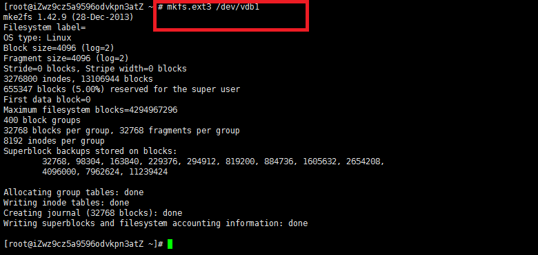 使用“mkfs.ext3 /dev/xvdb1”命令对新分区进行格式化,格式化的时间根据硬盘大小有所不同。(也可自主决定选用 ext4 格式)