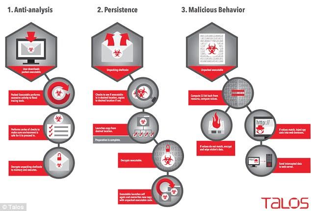 Talos Group的安全专家本·贝克(Ben Baker)与阿历克斯·邱(Alex Chiu)写道:“这款恶意软件之所以十分独特,是因为一旦其发现与恶意软件分析相关的特定属性后(即可能被发现迹象),它就会积极尝试毁掉计算机。”