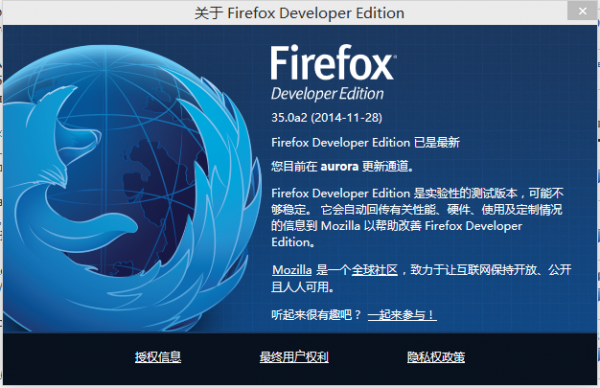 Mozilla Firefox 35.0 Beta 1 发布,内核版本升级至Gecko 35,正式发布时间是2015年的1月份,主要增加了“Firefox Hello”语音通话特性以及增强的分享功能。需要注意的是,版本35同时还有一个被标记为Alpha的Developer Edition版本,后者与Beta版本相比的功能要多出许多。