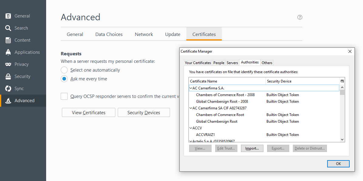 用户无法自主管理Firefox证书存储中的所有CA证书,目前需要手动寻找Windows 系统根证书存储中的对应CA证书,这点可能在未来某个版本改变为直接自动搜索。
