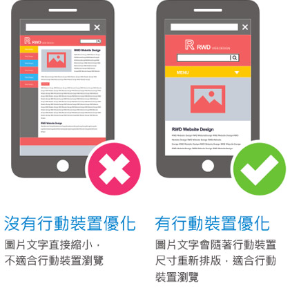 电脑版网站会带给行动装置浏览和使用上的不便。使用者在浏览尚未针对行动装置最佳化的网站时,必须靠双指拨动或缩放萤幕才能阅读网站内容,因此在使用上什感不便之余,很可能就会放弃浏览您的网站。反观适合行动装置浏览的版本不仅容易阅读,使用上也极为流畅方便。 在美国,智慧型手机使用者中有94%的人会透过手机搜寻当地资讯。有趣的是,77%的行动装置搜寻都发生在使用者的住家或公司,而这些都是可能会有桌上型电脑的地方。