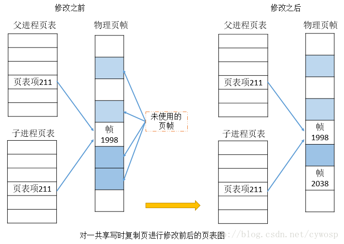 当程序调用fork()函数并返回成功之后,程序就将变成两个进程,调用fork()者为父进程,后来生成者为子进程。这两个进程将执行相同的程序 文本, 但却各自拥有不同的栈段、数据段以及堆栈拷贝。子进程的栈、数据以及栈段开始时是父进程内存相应各部分的完全拷贝,因此它们互不影响。从性能方面考虑,父 进程到子进程的数据拷贝并不是创建时就拷贝了的,而是采用了写时拷贝(copy-on -write)技术来处理。调用fork()之后,父进程与子进程的执行顺序是我们无法确定的(即调度进程使用CPU),意识到这一点极为重要,因为在一 些设计不好的程序中会导致资源竞争,从而出现不可预知的问题。下图为写时拷贝技术处理前后的示意图: