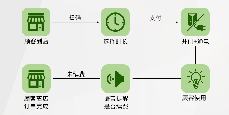 顾客购买的使用时间结束前,智能控制箱还有语音提醒顾客剩余时间,方便顾客续费或提前准备离店。智能控制箱配套有云端管理系统。商家通过手机或电脑即可登陆,通过系统对控制箱进行管理。包括设置金额、使用时长以及查看交易数据。云端管理系统除了基本的设备管理和交易统计以外,还具有多种增值功能。例如:在线预约、会员充值等。
