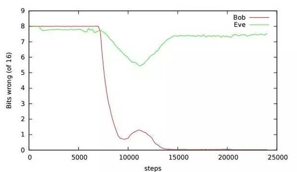 结果……喜忧参半。随着Bob不再重建Alice的信息,部分尝试变成了一个彻底的失败。在大部分时间当中,Alice和Bob设法改进了系统,在这个系统中它们的通讯几乎没有什么错误。在部分测试中,Eve的猜测较随意猜测有所提升,但是Alice和Bob通常会通过改进加密技术进行回应,直至Eve彻底失去机会(见曲线图)。