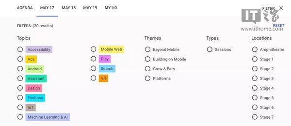 在本次会议当中,Android O 操作系统应该为最大的亮点,除此之外谷歌新款开发者手机 Pixel 2 也有望出现在会议当中,从行程表上的分类我们也能看到此次 I/O 主题共会有 Accessibility、Ads、Android 、Assistant、Design、Firebase、IoT、机器学习、Mobile Web、Play、Search 与 VR 这些主题,让许多对 Google 服务与功能有兴趣的朋友,能够依照自己关心的主题来挑选关注。