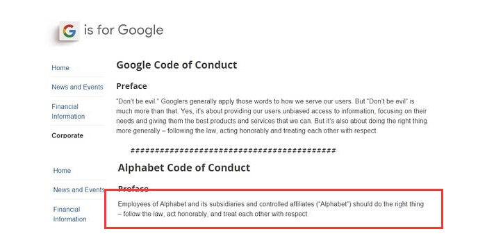 但 在今天,这一口号将随着历史而作古。据国外媒体报道,在谷歌正式更名“Alphabet”之后,新公司Alphabet 在本周五向内部所有员工发布了公司新的行为准则“应该做正确的事——遵守法律、行为端正并相互尊重“,而之前的“不作恶”并没有包括在内。对于为何选择这 一新准则,Alphabet 公司并没有对外作出解释。新准则如下: