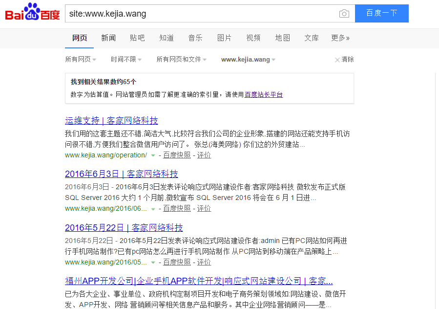 终于出现了。意思就是说,可能这个www.kejia.wang之前处于被K状态,百度一直在审核考察这个域名。不过时间终究很快过去。慢