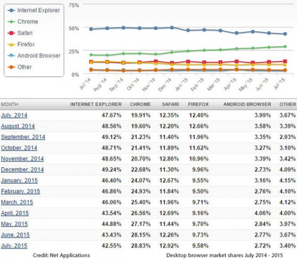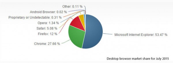 根据市场调研公司Net Applications发布的浏览器趋势报告,IE在2014年7月的全球市场份额为47.67%,2015年7月为42.55%。Net Applications在2015年7月的报告显示,IE在桌面浏览器市场的份额为53.47%。