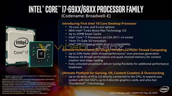 性能方面,Intel官方表示,相比上代产品,Broadwell-E的性能提升至少可达15%,最高可达35%。