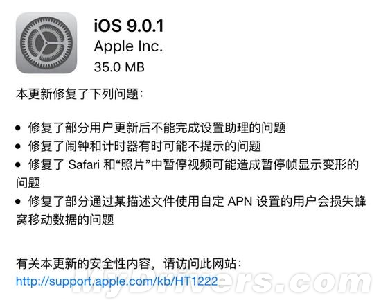 今天,苹果正式发布了iOS 9.0.1系统,大小约为35MB。