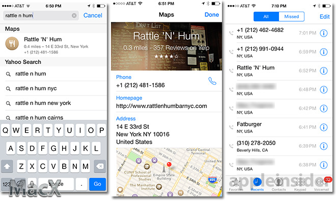 iOS 8 Beta 5 最新一个被挖掘出来的隐藏功能显示, 当用户从 Maps (地图应用) 中找到感兴趣的商家, 并且有意电话联络, Phones (电话应用) 中的 Recents (去电历史) 将会获取商家名称, 地址, 甚至 Yelp 点评数据. 因为 Maps 搜索结果可以通过 iOS 8 的 Spotlight 得到, 所以用户也可以不用打开 Maps 就能给商家打电话.