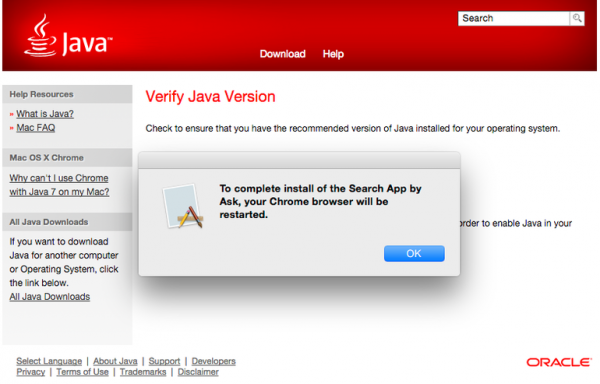 几年来,虽仅限于Windows平台,但甲骨文一直为Java捆绑Ask toolbar广告软件。最近发布的Mac版Java软件中,甲骨文也将Ask Toolbar设置为默认安装,并静默修改了浏览器主页。Ask这个插件一直不受欢迎,其搜索引擎的检索结果质量很低,还经常加载许多广告。