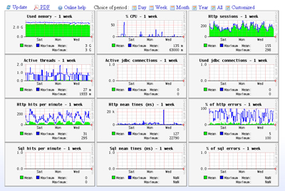 JavaMelody 能够监测Java或Java EE应用程序服务器,并以图表的方式显示:Java内存和Java CPU使用情况,用户Session数量,JDBC连接数,和http请求、sql请求、jsp页面与业务接口方法(EJB3、Spring、 Guice)的执行数量,平均执行时间,错误百分比等。图表可以按天,周,月,年或自定义时间段查看。