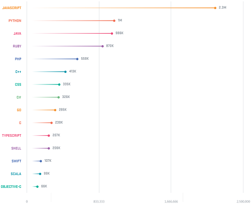 2017 年 GitHub 发布的年度开发者报告中,JavaScript 依然是最受欢迎的语言。排名第一是 JavaScript,而且远甩其他语言好几条街。联想到近几年前端技术的火热发展,所以也算是意料之中。