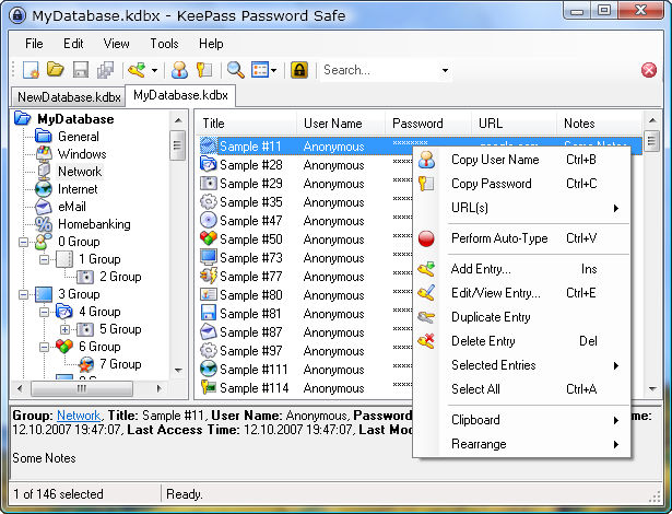 KeePass是一款密码管理工具.它能帮你记住电子邮件,主页FTP,上网,论坛等用户名和密码,而免去了你众多的烦恼,节省了时间.它把密码保存在高度加密的数据库中,不能让其他人和其他应用程序所识别.