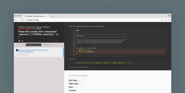 filp / whoops package 曾经出现在 V4 系列,用于在调试时提供优雅的堆栈跟踪,是一个错误处理框架。Laravel 5.5 版本 Whoops Package 正式回归。