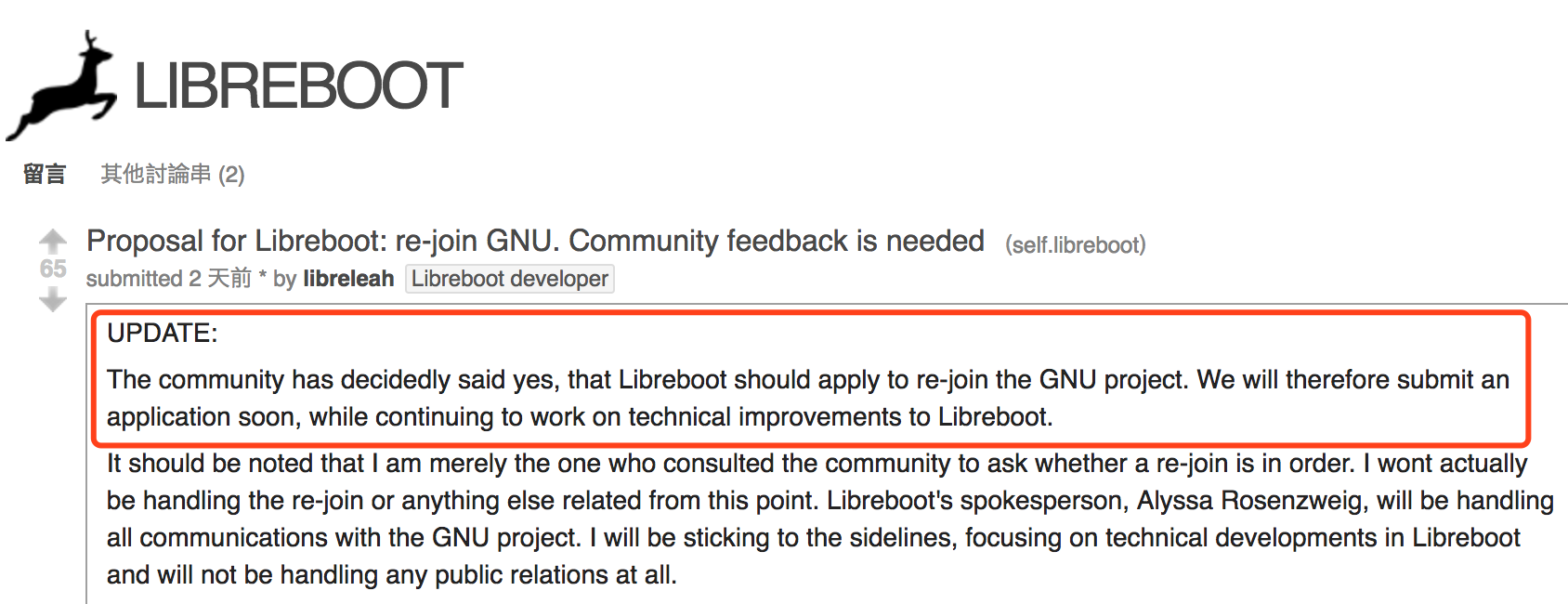 Libreboot 项目的原维护者 Leah Rowe 在社区发起请愿,征询重新加入 GNU 的意见。而通过社区用户的反馈,最终结果确认是要重新加入 GNU ,他们将很快提交申请。