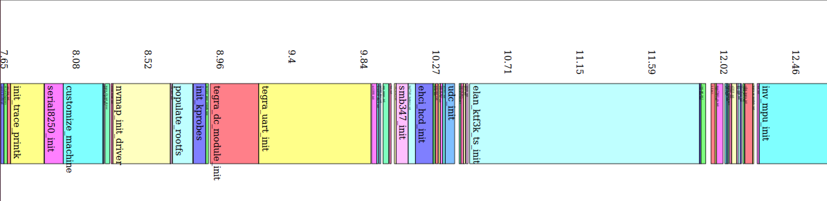 对于内核启动的优化,可以通过bootgraph.pl脚本(位于内核源码的script/bootgraph.pl)来绘制内核启动耗时图表,用以分析启动最耗时的地方。这个脚本使用非常简单,直接将dmesg的输出作为其输入,即可生成svg图表: