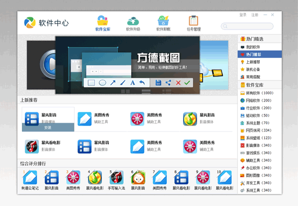 - 功能上,除了具备了一键式的安装、升级与卸载操作的通用功能外,在中心首页面,对所有软件进行了精心分类,用户可以快速地从软件仓库中找到自己喜爱的软件;