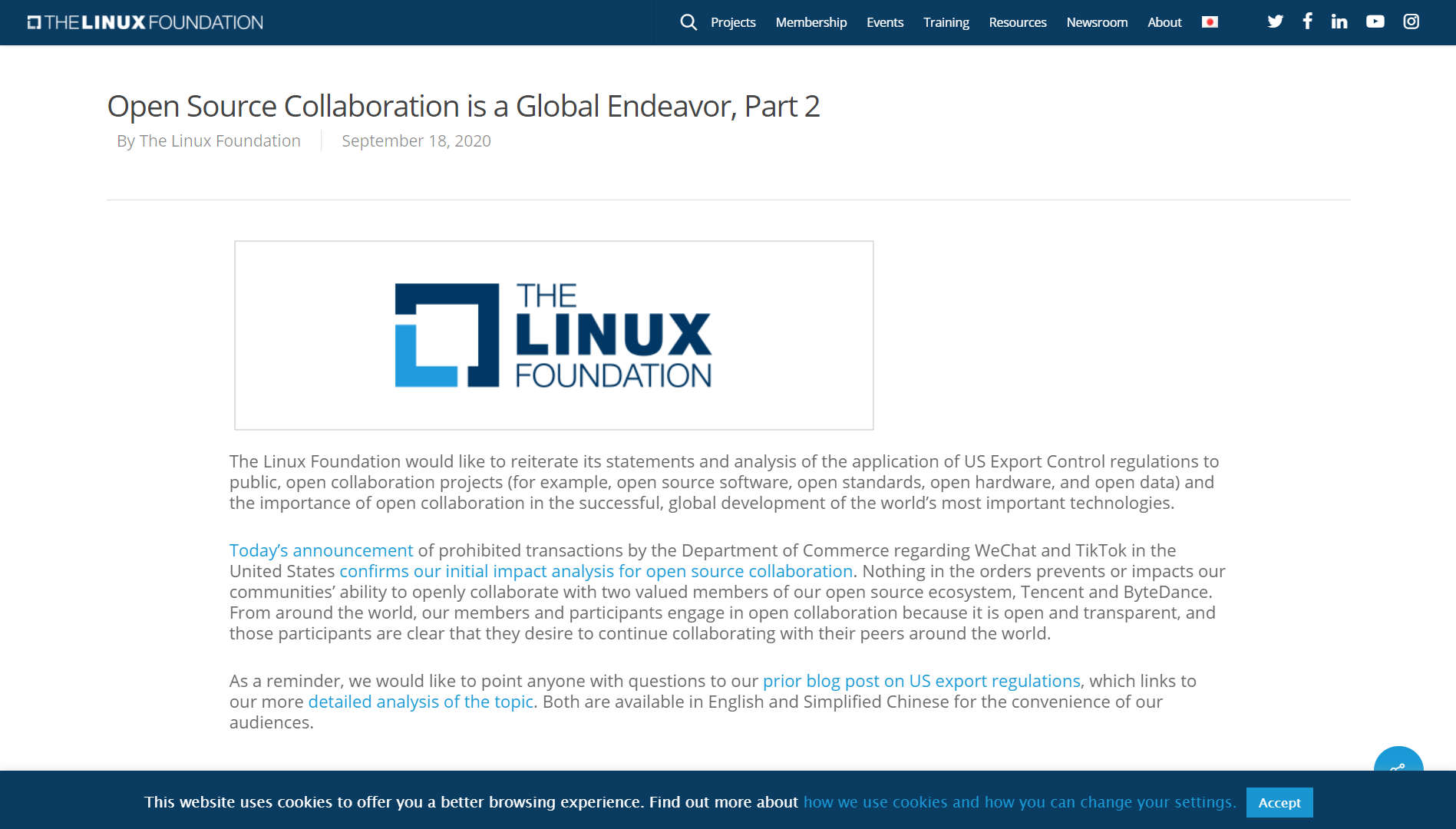 Linux 基金会迅速做出解读,再次强调美国出口管制条例不会令开源受阻,并呼吁全球范围内的开源协作。这篇文章题为《开源协作是一项全球努力 第二部分》,全文如下: