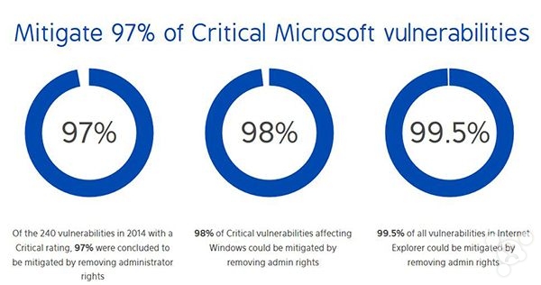 本周,英国一家名为 Avecto 的安全公司发布的一份最新安全报告显示,2014 年微软公布和修复的 240 个安全漏洞中,超过 97% 与管理员权限被利用有关。同时,该公司对用户的第一建议是,尽量使用标准用户帐户,以充分保证系统的安全。