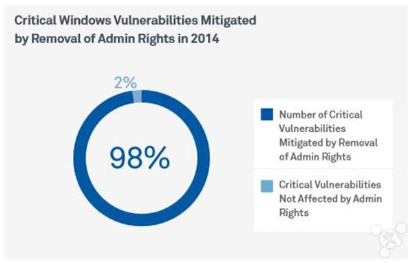 Avecto 表 示,其统计关于 Windows 关键安全漏洞统计的数据中,超过 98% 的漏洞利用了管理员权限。换句话说,入侵者或黑客只有 2% 采用了不同的攻 击方式。当电脑连接 Internet Explorer 后比例还会上升,99.5% 的漏洞与管理员权限有关,所以更应该选择不在管理员账户下使用电 脑,可能的话甚至禁用 Guest 帐户。