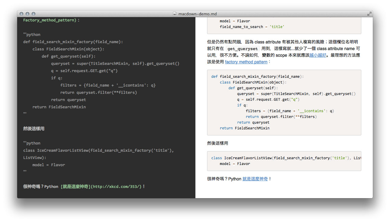 MacDown 是一款 Mac 下的 Markdown 编辑器。由于 mou” target=”_blank”>Mou 的作者曾宣布不再继续该软件的开发并寻求出售所有权,所以 Macdown 的作者决定自己开发,MacDown 的很大一部分受到了 Mou 的影响。