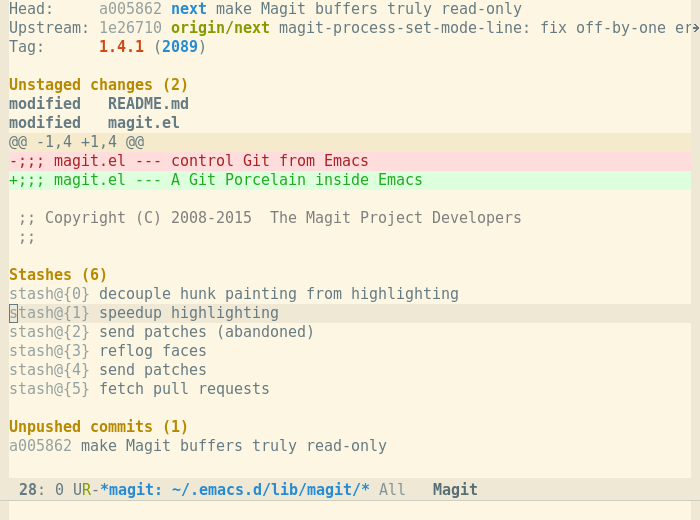 Magit 是 Git 版本控制系统的接口,作为一个 Emacs 包实现的。它封装了绝大多数 Git 命令,可直接在 Emacs 编辑器中使用。
