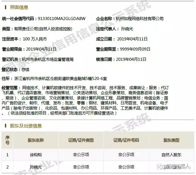 据国家企业信用信息公示系统资料显示,杭州如程网络科技有限公司成立于2019年4月11日,注册资金100万。知情人表示:如程是民宿众筹公司开始吧孵化的项目,在项目前期,开始吧CEO左志坚为其频频站台,后又请到借宿CEO、杭州市民宿行业协会执行会长夏雨清担任CEO,如程发展更为迅猛。