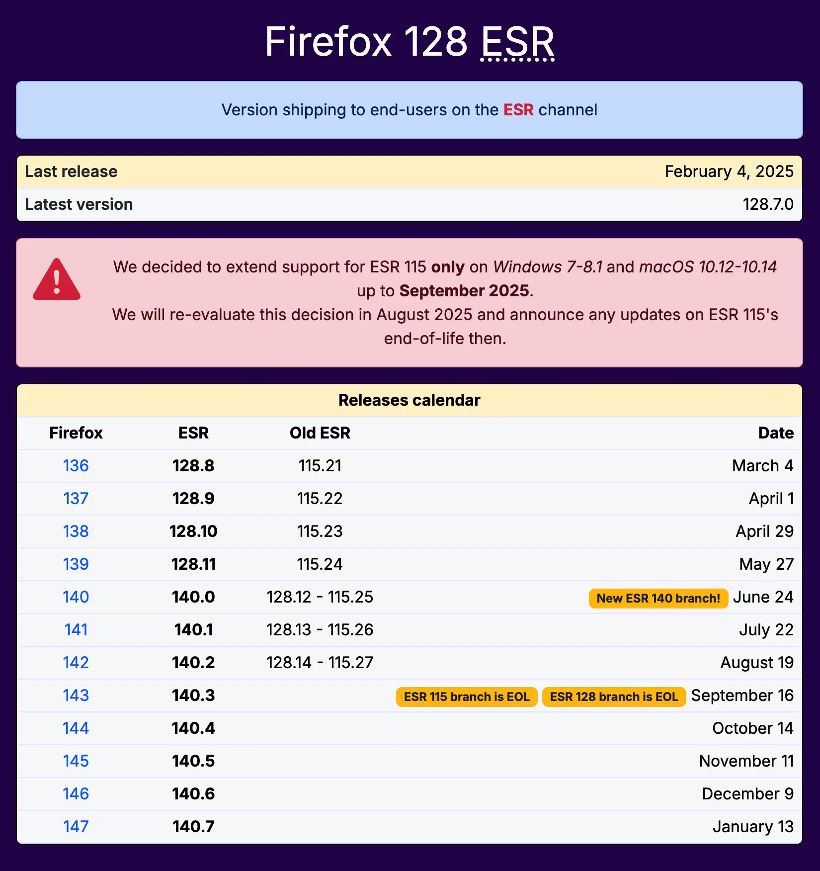 根据官方发布日历,Firefox 115 ESR 将继续接收更新,直到 2025 年 9 月。