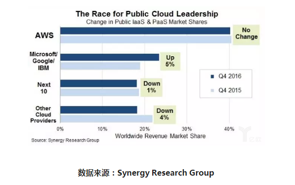 在当前公有云市场,距离AWS,排名次位的微软还有相当大的差距。据独立市场调查机构Synergy Research Group调查,截至2016年底,AWS已经控制了40%的云计算基础设施市场份额,而微软、google和IBM三家联合占据市场的23%。