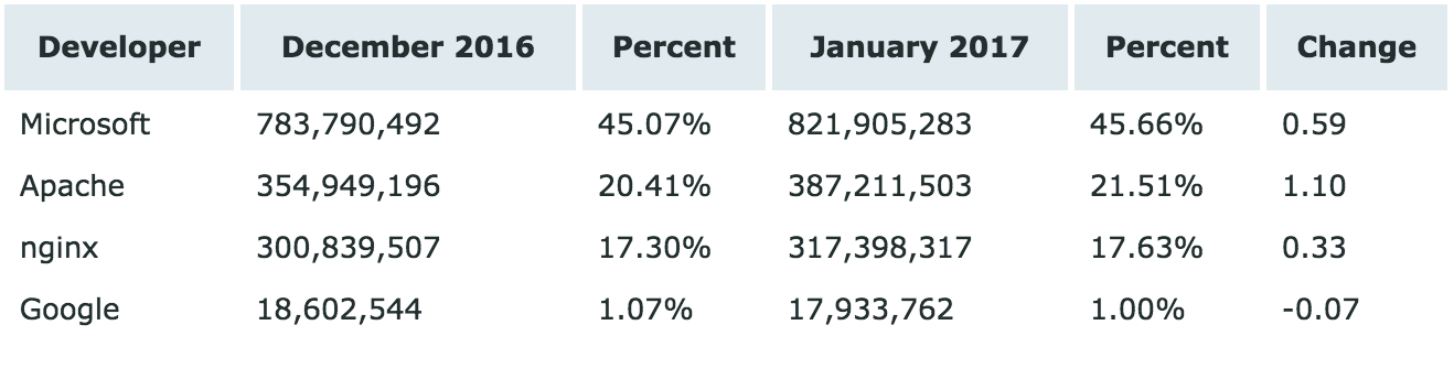 Netcraft 发布了2017年1月 Web 服务器调查报告,排名前三的依然是巨头 Microsoft、Apache 和 Nginx 。