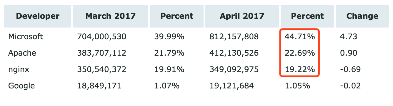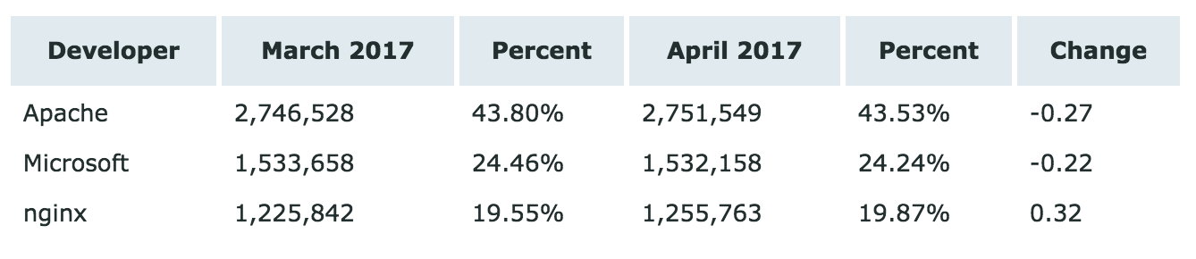 Netcraft 发布了2017年4月 Web 服务器调查报告,排名前三的依然是巨头 Microsoft、Apache 和 nginx 。