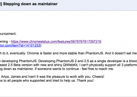 PhantomJS 的核心开发者之一 Vitaly Slobodin 近日宣布,已辞任 maintainer ,不再维护项目。Vitaly 发文表示,Chrome 59 将支持 headless 模式,用户最终会转向去使用它。Chrome 比PhantomJS 更快,更稳定,也不...
