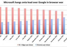 凤凰科技讯 北京时间3月2日消息,据科技网站PCWorld报道,最新数据显示,上月微软在浏览器市场的份额(Edge+IE浏览器)创历史新低,如果这样的趋势持续下去,恐怕5月份微软就会将浏览器市场头把交椅让给谷歌了。...