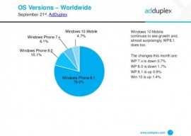 著名广告服务商AdDuplex今天发布了Windows Phone的市场数据,数据抓取9月21日当天24小时的状况。其中比较值得关注的是,Windows 10 Mobile占有率在Windows手机阵营中相较上个月又有上涨,达到了4.7%,相比上个月涨了1.4%。考虑到该系统目前还在开发中,仅发布预览 版,这个成绩还是不错的。