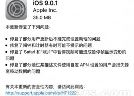 今天,苹果正式发布了iOS 9.0.1系统,大小约为35MB。本次的更新主要修复了,闹钟、计时器、Safari、蜂窝移动数据等几项Bug,同时有部分之前说iOS 9卡的用户表示,升级新系统后,感觉流畅了些,不知道是不是心里作...